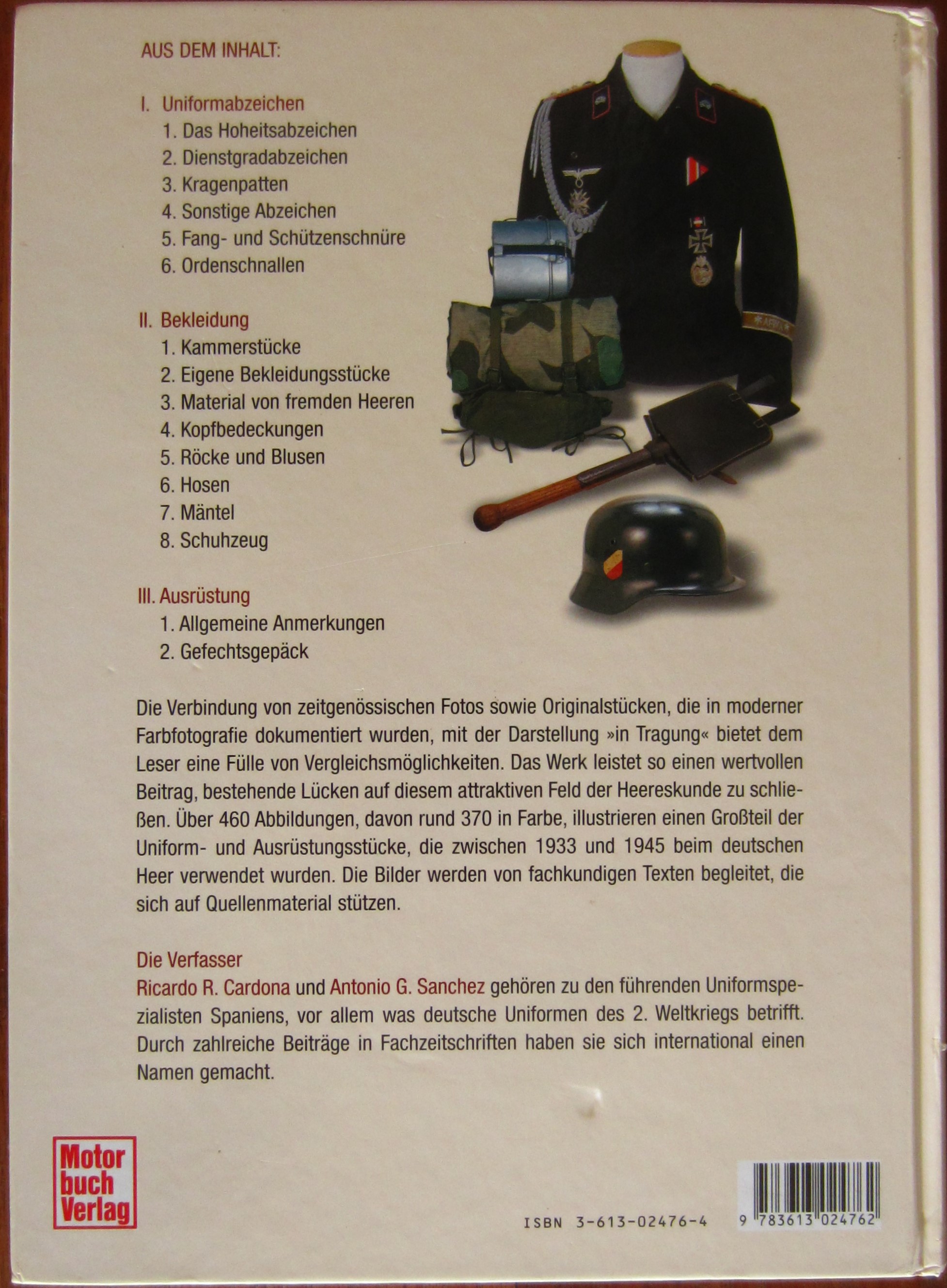 - Das Interesse an den deutschen Uniformen des Zweiten Weltkriegs hat zahlreiche Bücher hervorgebracht. Und dies vor allem in den USA, Großbritannien, Frankreich und Spanien, wo einige der besten Titel zum Thema erschienen. Das vorliegende Werk zeichnet sich besonders durch das Bildmaterial aus, das wesentlich umfangreicher ist als dies bei den meisten vorhergegangenen Büchern der Fall war. Die Verbindung von zeitgenössischen Fotos und Originalstücken, die in moderner Farbfotografie dokumentiert wurden, bieten dem Leser eine Fülle von Vergleichsmöglichkeiten. Die Bilder werden von fachkundigen Texten begleitet, die sich auf Quellenmaterial stützen.