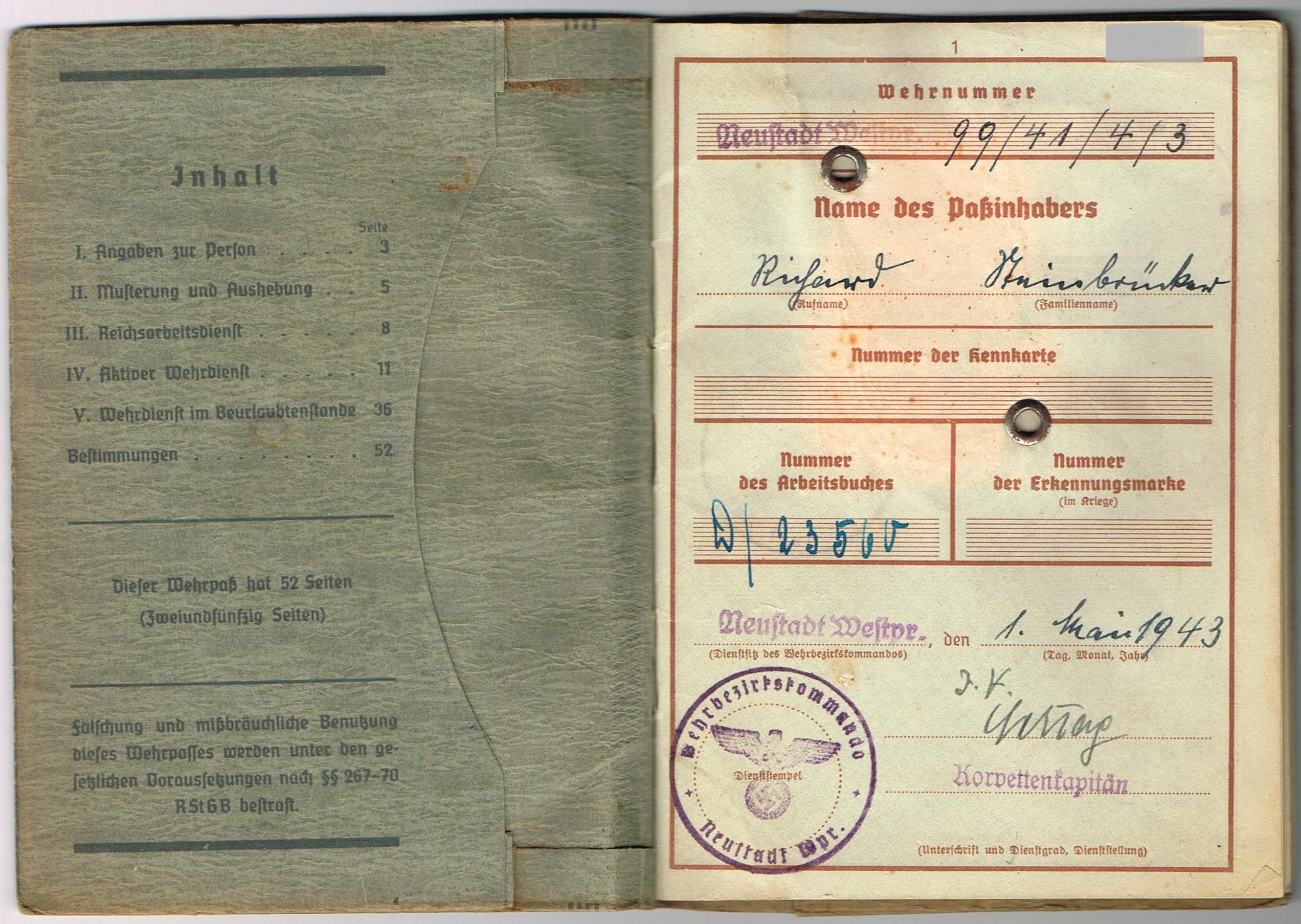 Wehrpass 2nd model - Nr 99/41/4/3 - WehrBezirkskommando Neustadt (West-Preussen)