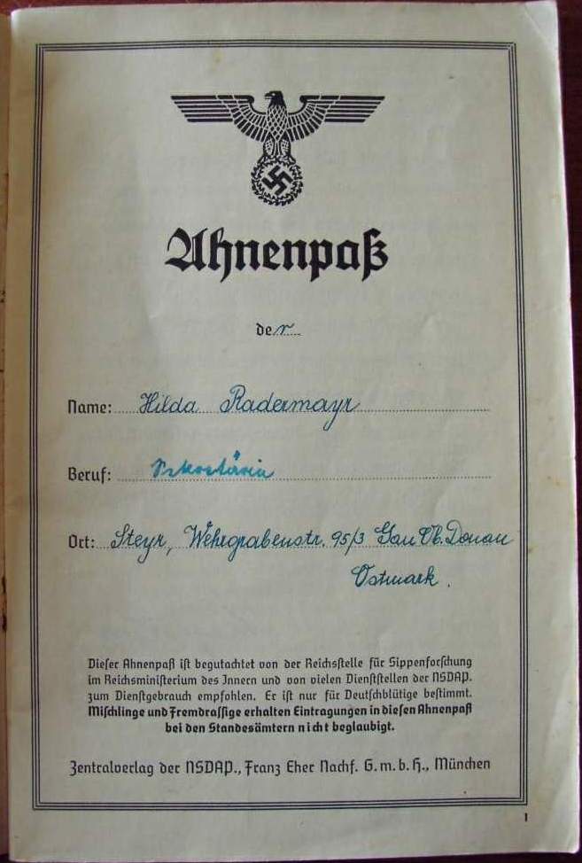 Ahnenpass (brown) - eagle on swastika - Hilda Radermayr