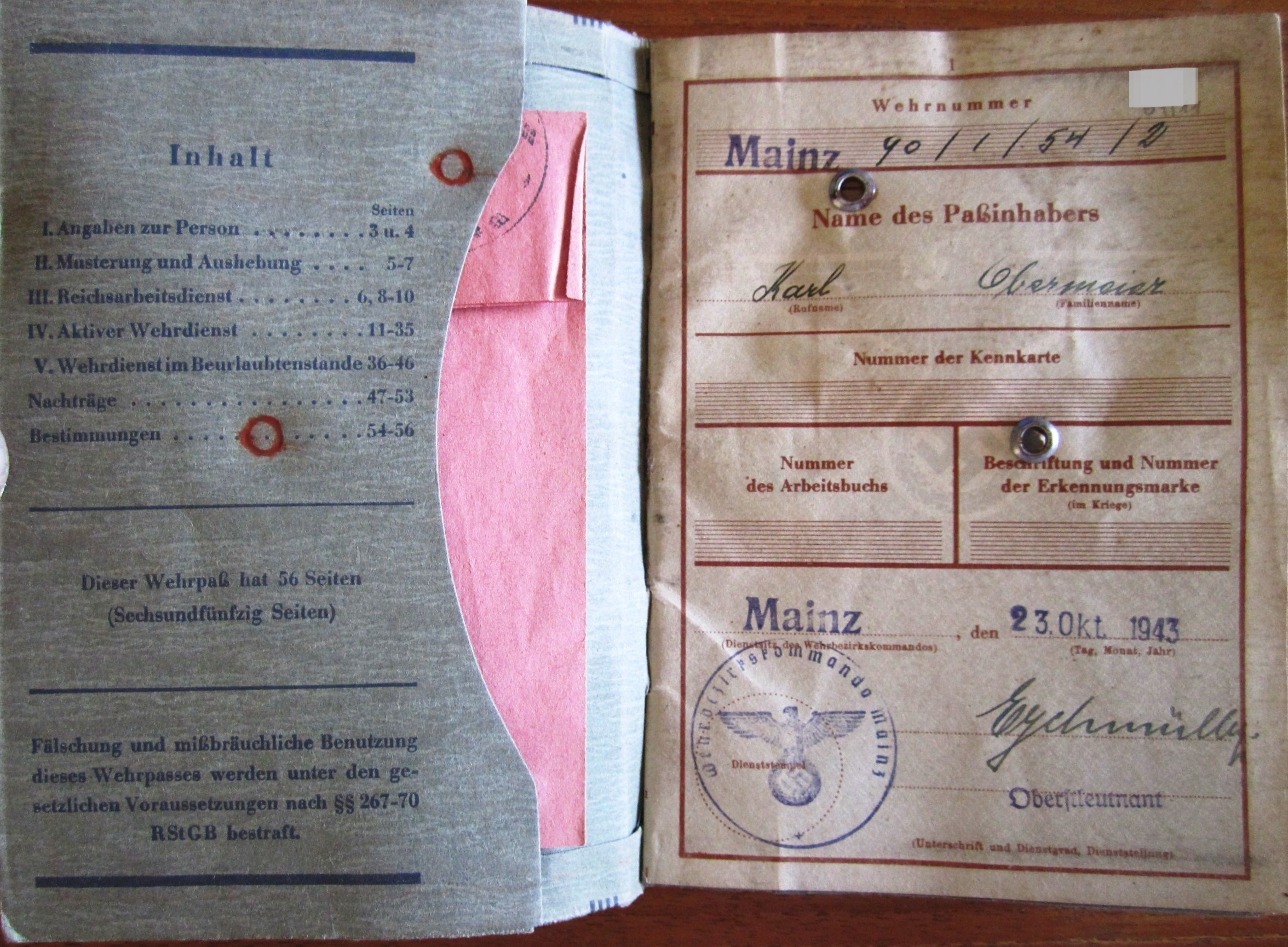Wehrpass 2nd model Heer - Nr40/1/54/2 + Wehrpass Notiz F - Karl Obermeier