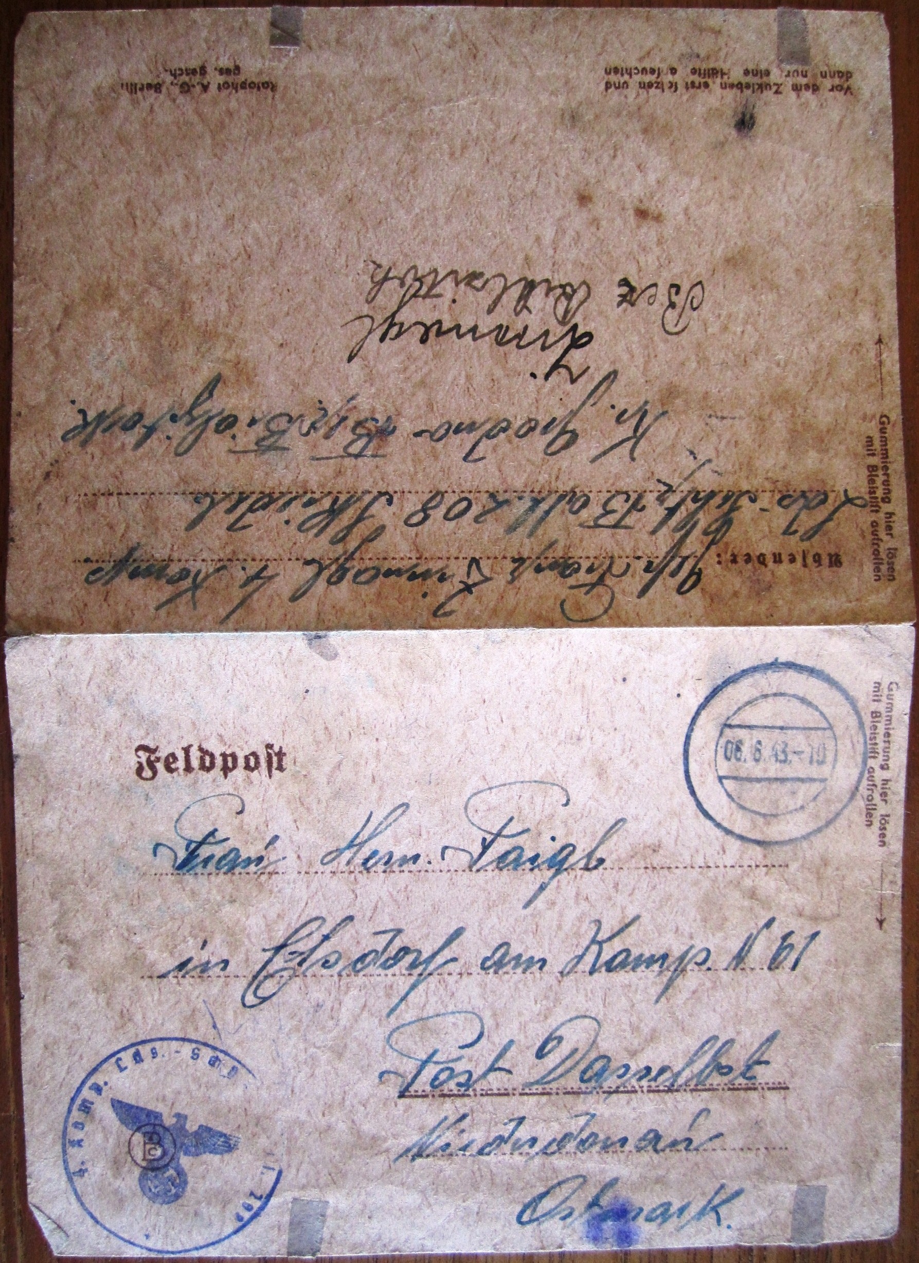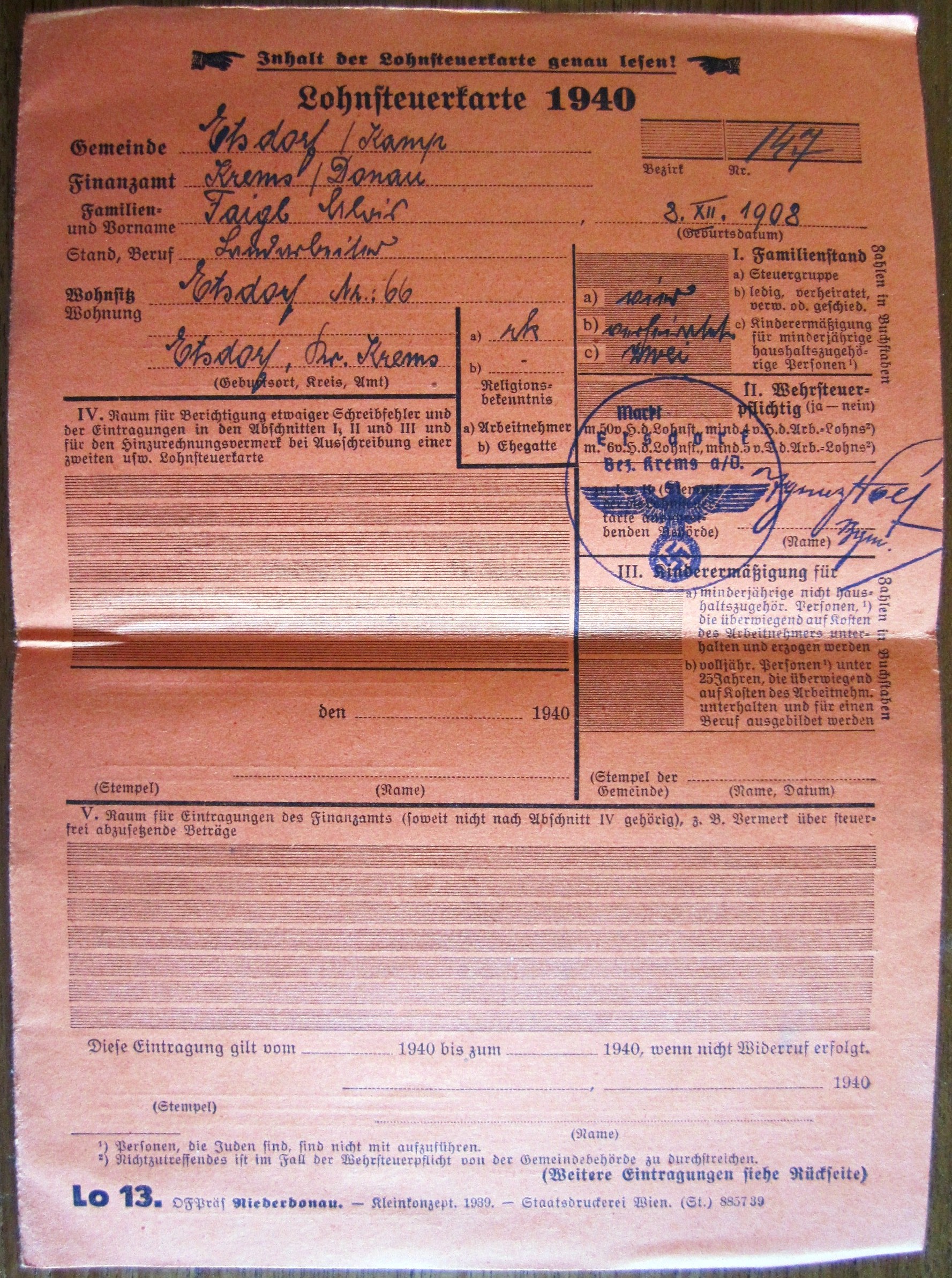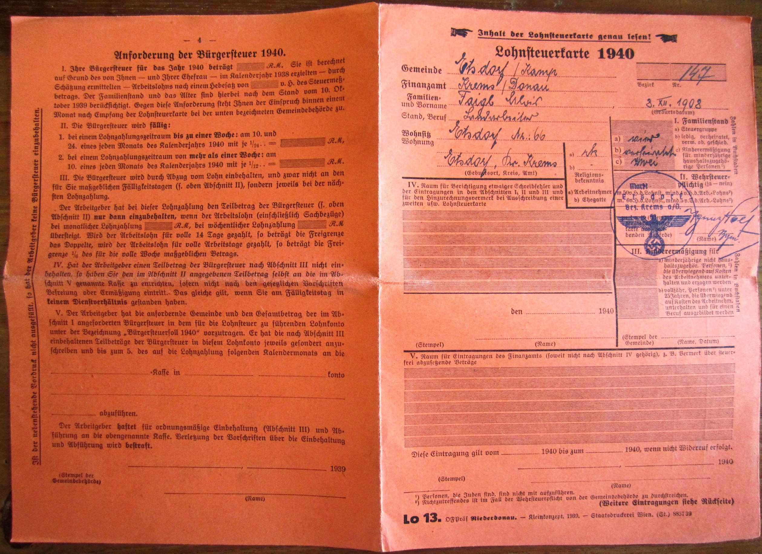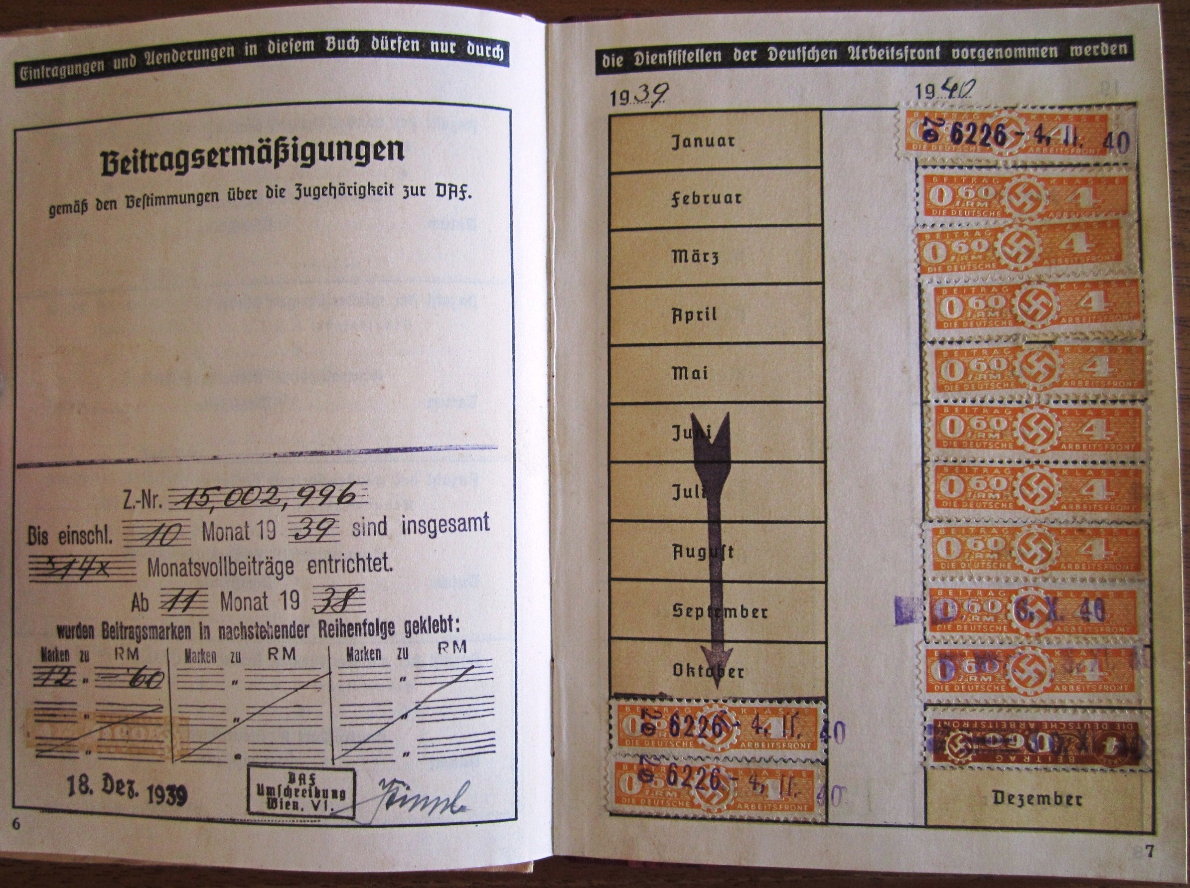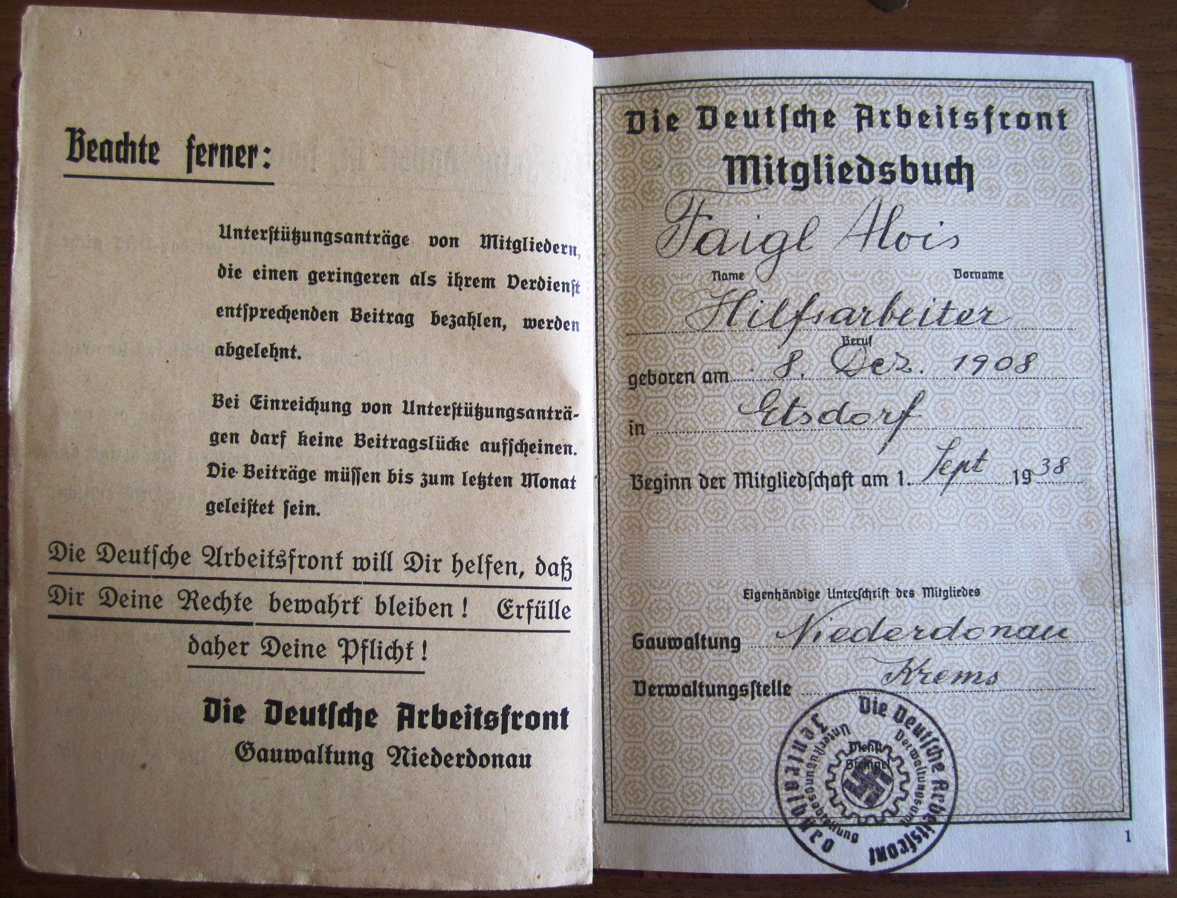 DAF Mitgliedsbuch - Faigl Alois + Merkblatt + Lohnsteuerkarte 1940 + 2 Feldpostbriefe