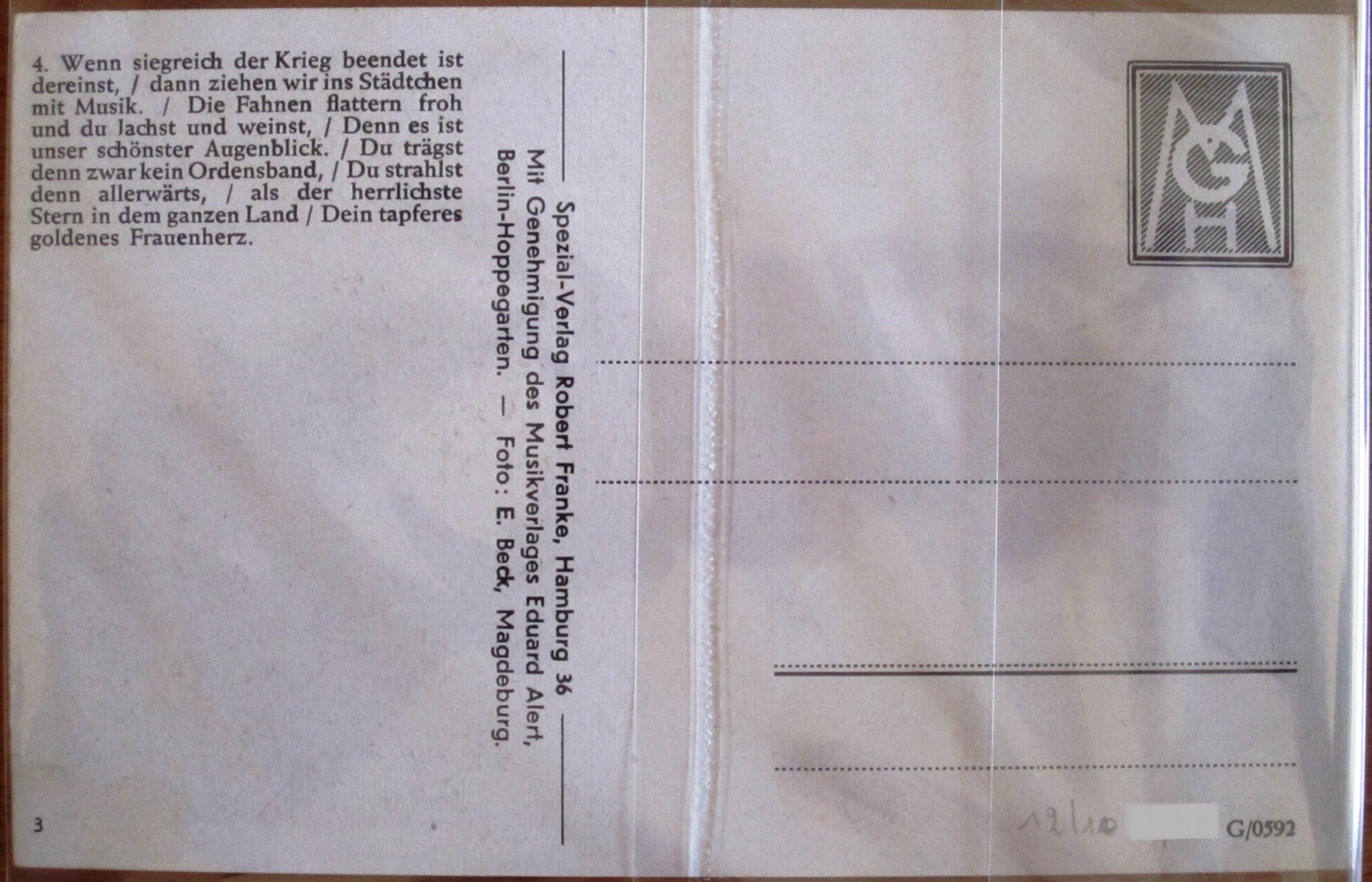 Postcard : Song : Tapfere kleine Soldatenfrau - Special-Verlag Robert Franke, Hamburg 36 - G/0592