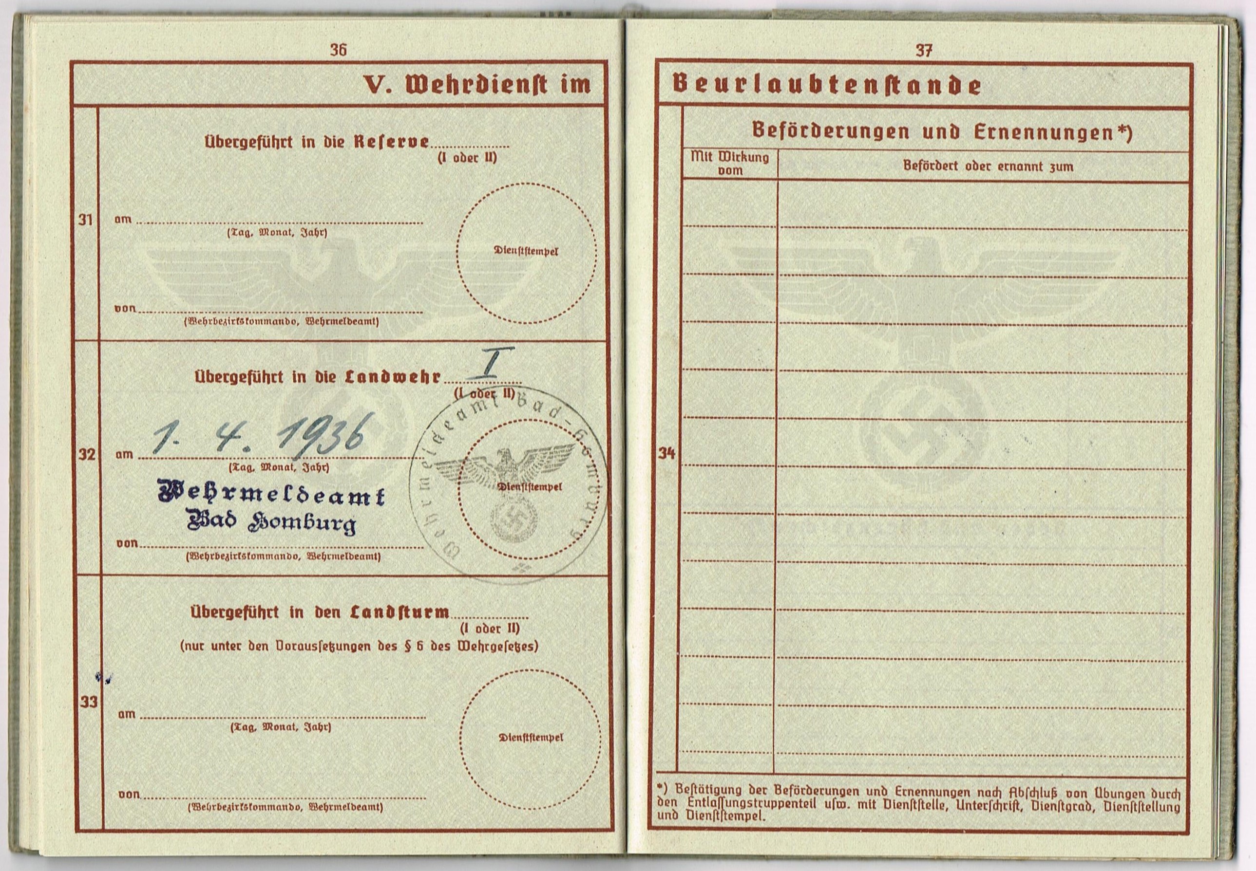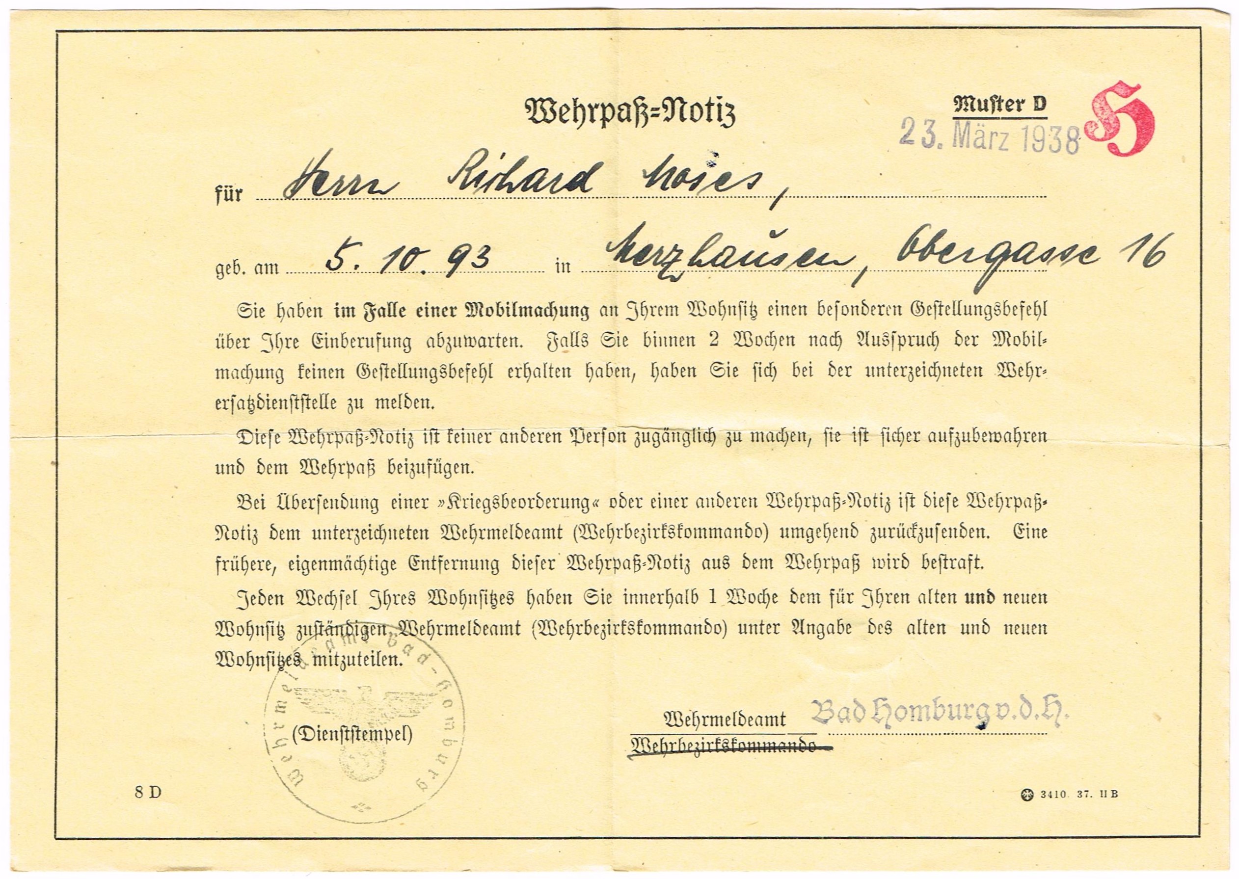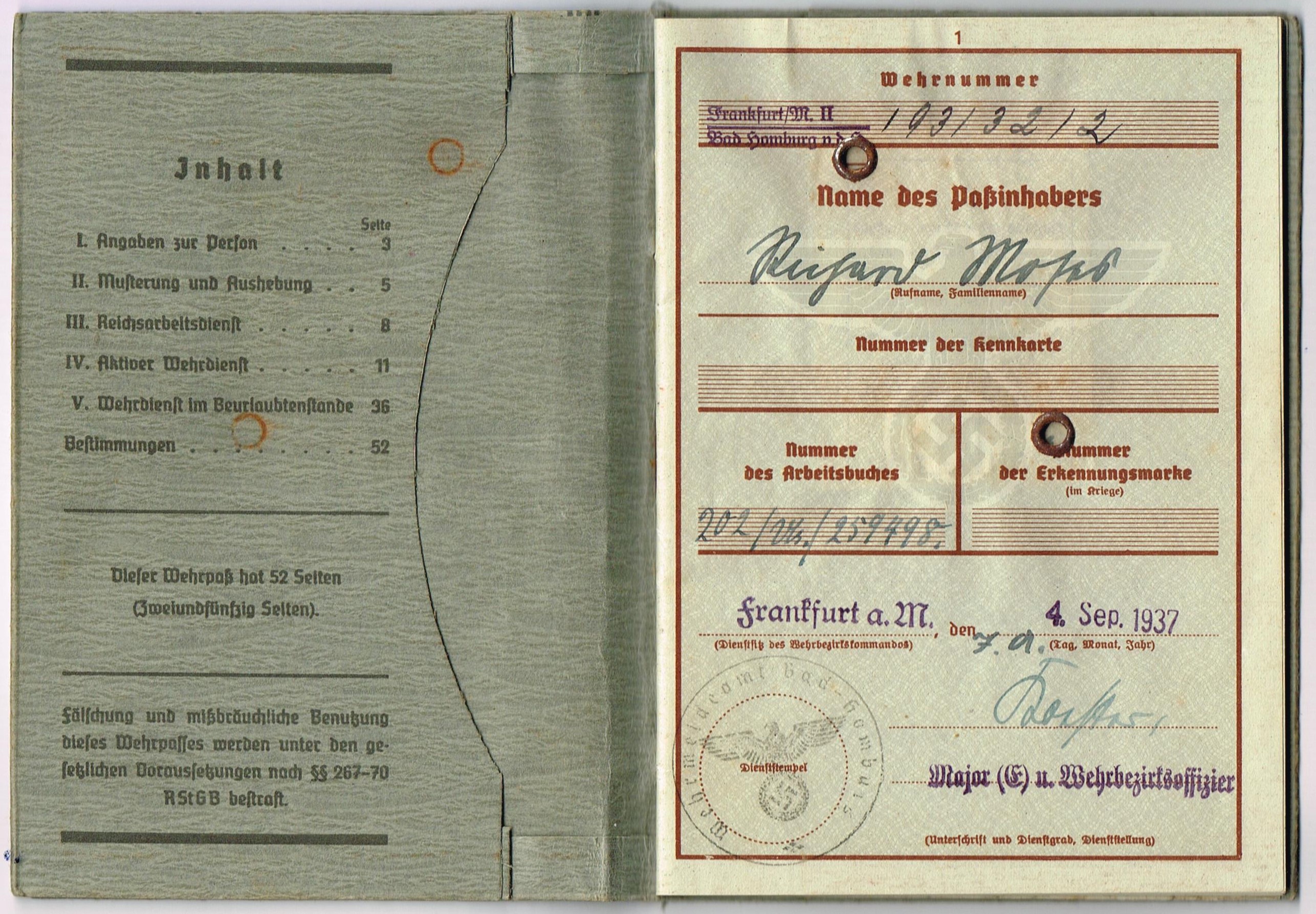 Wehrpass 2nd model + UK-Stellung + Wehrpass Notiz Muster D - 193/32/2 - Richard Moses